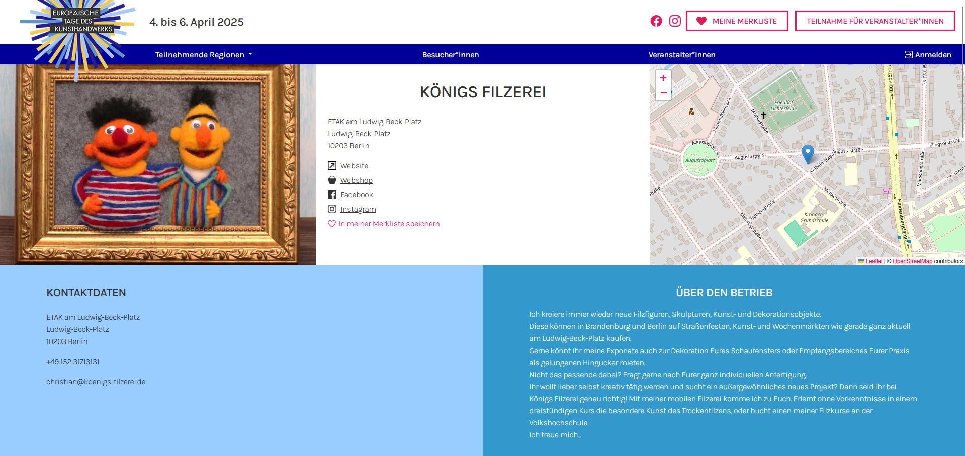 Kunsthandwerkstage.de ist eine Informationsseite für deutsche Kunsthandwerksbetriebe, die auch als Anmeldeplattform und Datenbank für die Handwerkskammer Berlin sowie 15 weitere Kammern dient. Als Anlaufstelle für interessierte Besucher und Veranstalter repräsentiert die Website die Kammern, Betriebe und jährlichen Veranstaltungen der ETAK in Deutschland.