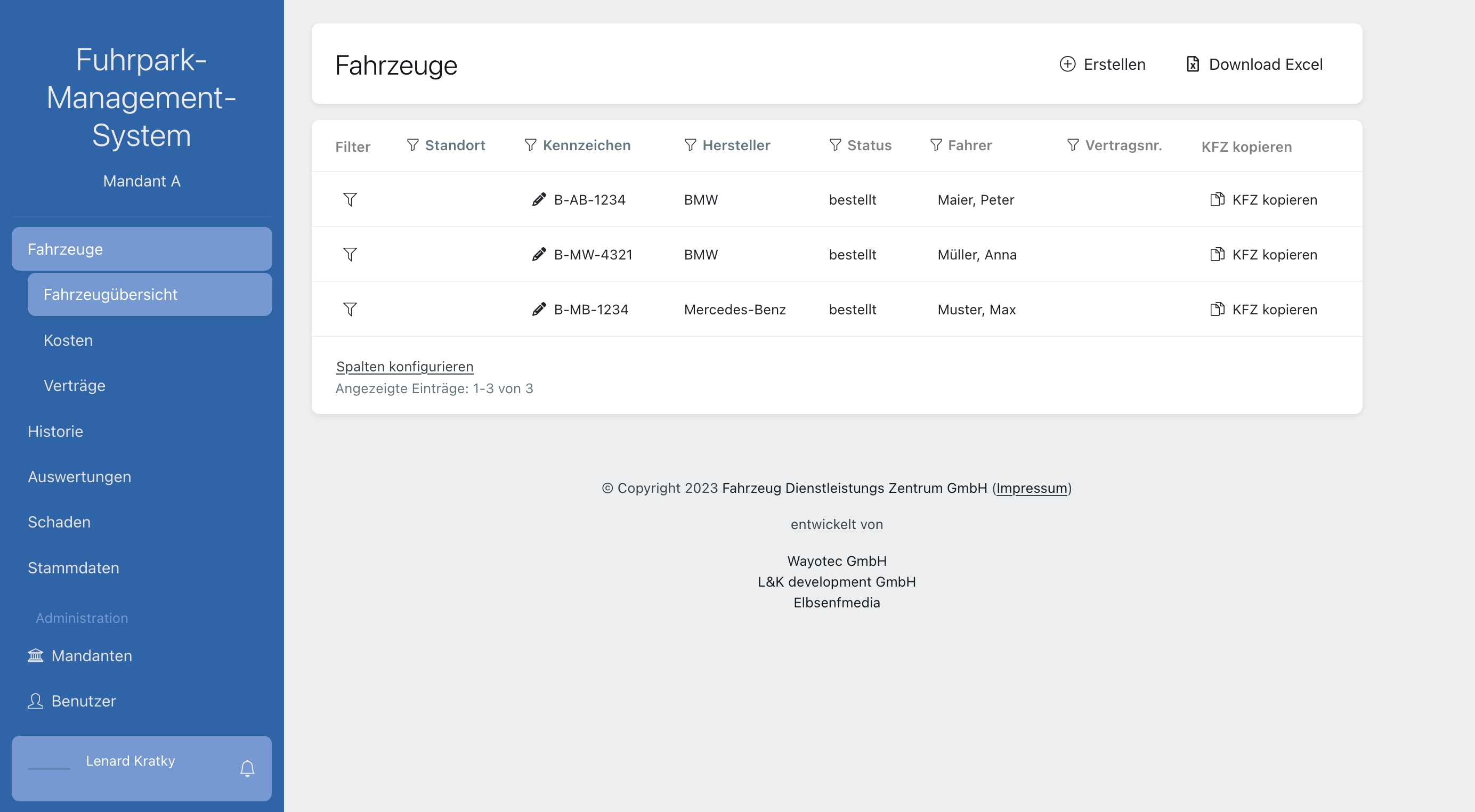 Das System ist mandantenfähig und bietet eine ausführliche Übersicht und Verwaltung aller Fahrzeuge des jeweiligen Mandanten. Benötigte Infos wie Kennzeichen, Hersteller, Fahrer, Firma, Kostenstelle etc. können problemlos in der Ansicht und beim Editieren ausgewählt werden. Kosten, Verträge und Schaden lassen sich ebenfalls im System einpflegen und Fahrzeugen zuordnen.