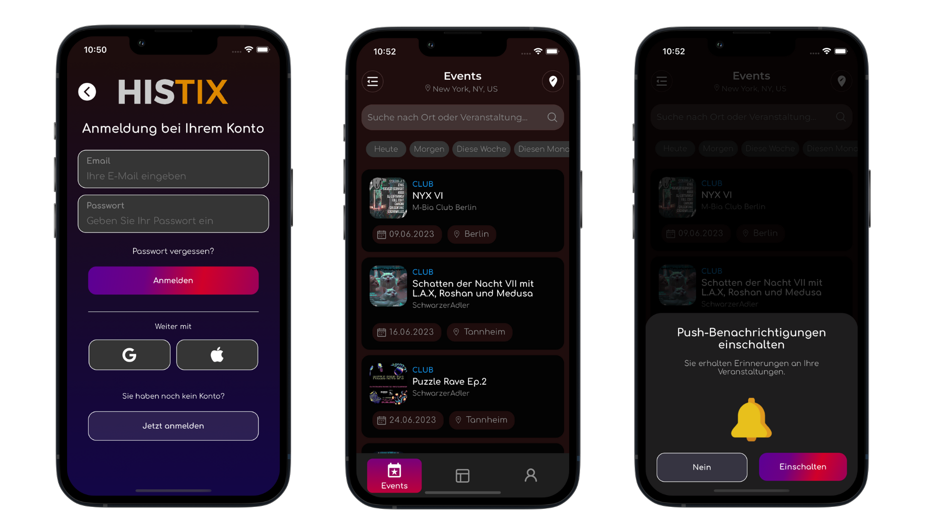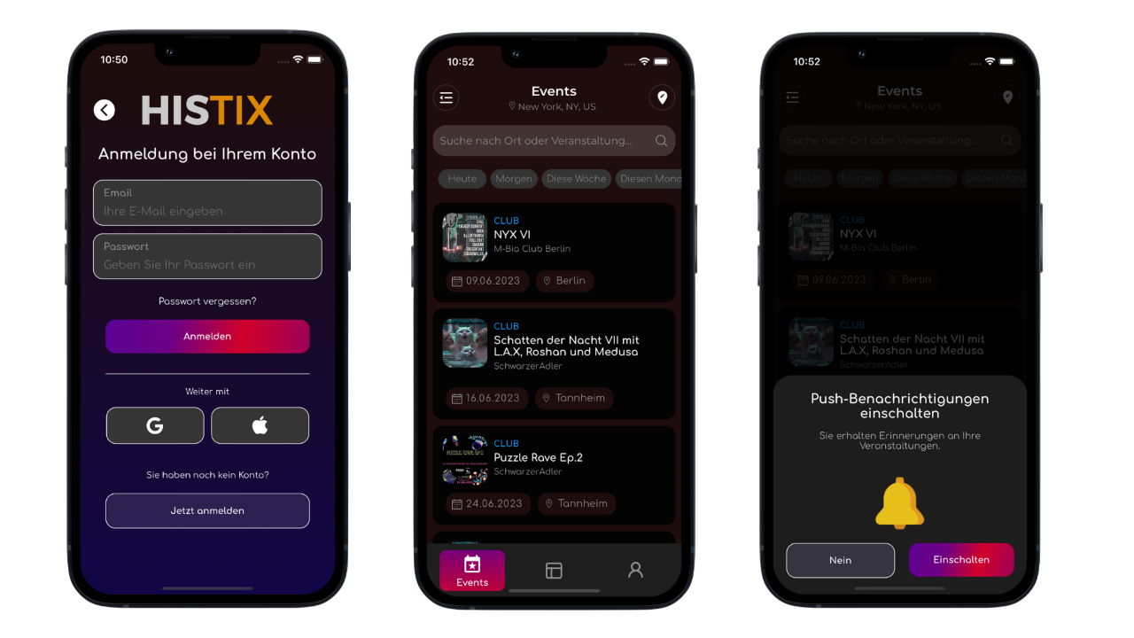 Mit Histix können Kunden Veranstaltungen durchsuchen, Informationen zu den Events anzeigen, Sitzplätze auswählen und Tickets direkt über die App kaufen. Die App bietet eine sichere Zahlungsschnittstelle, die verschiedene Zahlungsmethoden akzeptiert, um den Kunden Flexibilität und Komfort zu bieten.