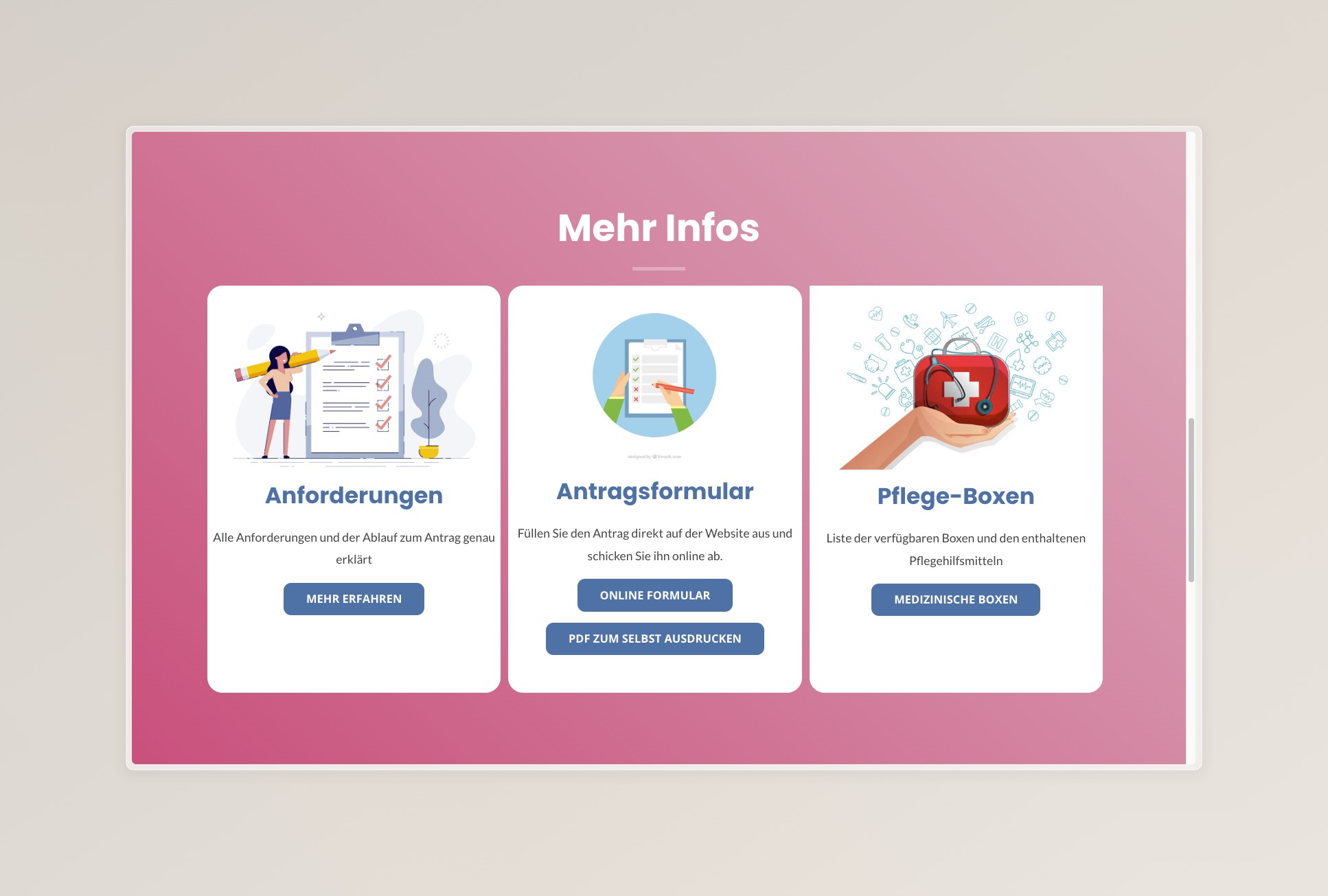 Die MediBox GmbH bietet eine Dienstleistung, die den Prozess der Beschaffung von Pflegehilfsmitteln für die häusliche Pflege vereinfacht. Das Unternehmen legt Wert auf einen schnellen und modernen Service in ganz Deutschland, um Zeit und Aufwand sowohl für die Pflegebedürftigen als auch für die Pflegenden zu reduzieren. Durch einen modernen Webauftritt und den Einsatz von digitalen Anträgen minimiert MediBox unnötige Bürokratie, damit die Kunden ihre Pflegehilfsmittel so schnell wie möglich erhalten.