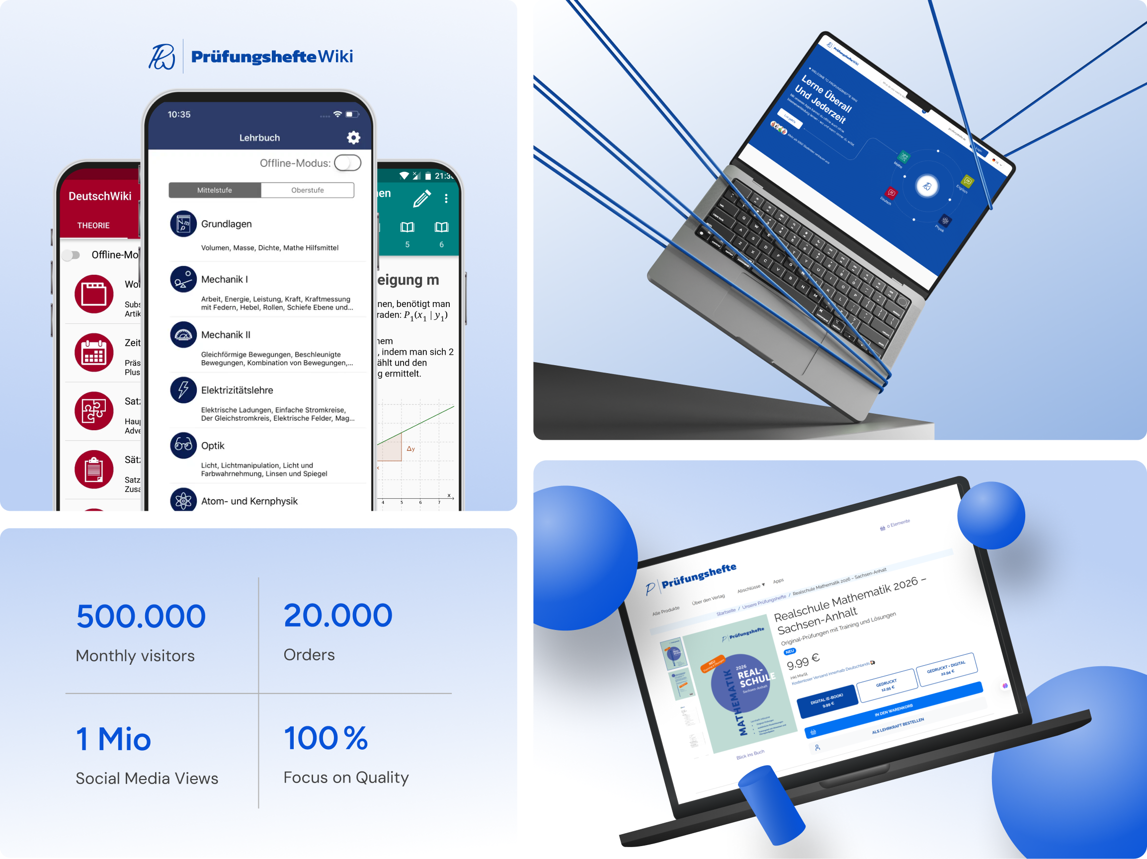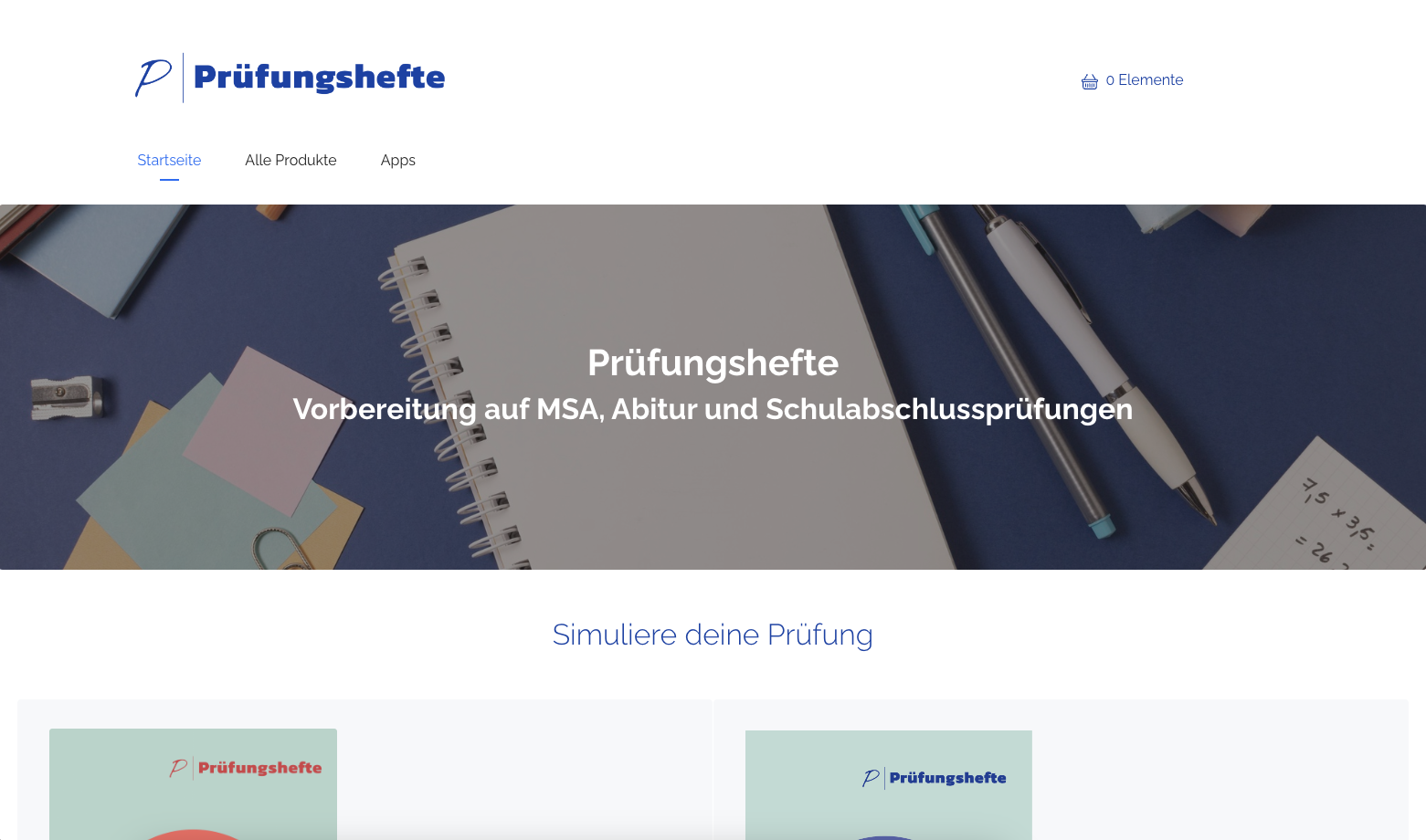 Ziel von Prüfungshefte ist es, Schülern und Lehrern einen zentralen Zugangspunkt für hochwertige Prüfungsvorbereitungsbücher (Abitur, MSA, Realschule, ...) zu bieten. Neben dem Online-Shop besteht die von uns entwickelte Plattform aus einer Drupal Multisite, die auch die Websites berlin-msa.de, abitur-berlin.de, realschule-hessen.de und viele mehr beinhaltet.