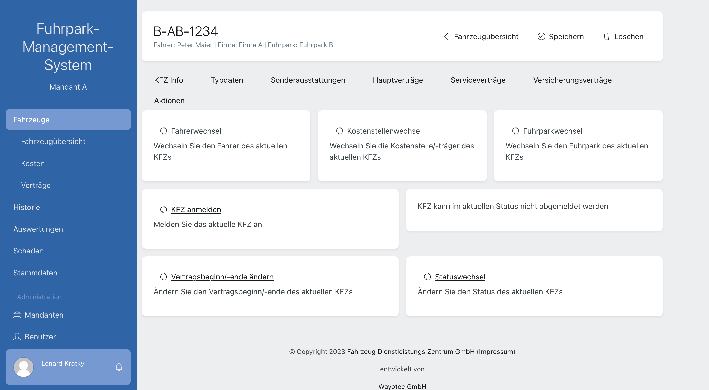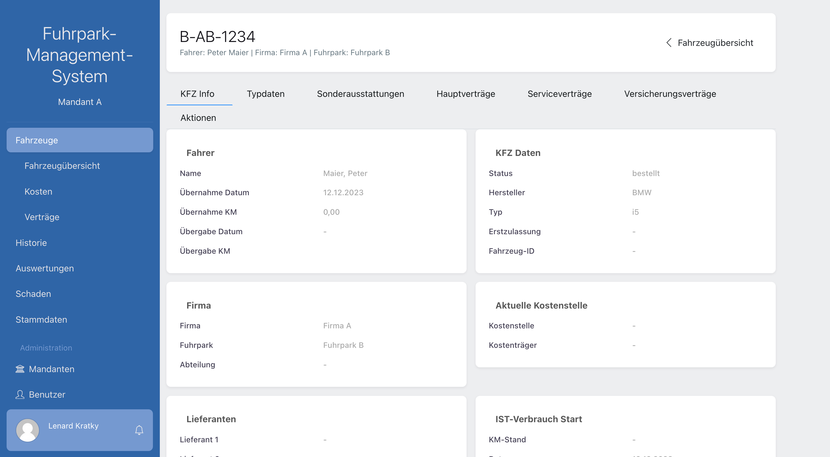 Das System ist mandantenfähig und bietet eine ausführliche Übersicht und Verwaltung aller Fahrzeuge des jeweiligen Mandanten. Benötigte Infos wie Kennzeichen, Hersteller, Fahrer, Firma, Kostenstelle etc. können problemlos in der Ansicht und beim Editieren ausgewählt werden. Kosten, Verträge und Schaden lassen sich ebenfalls im System einpflegen und Fahrzeugen zuordnen.