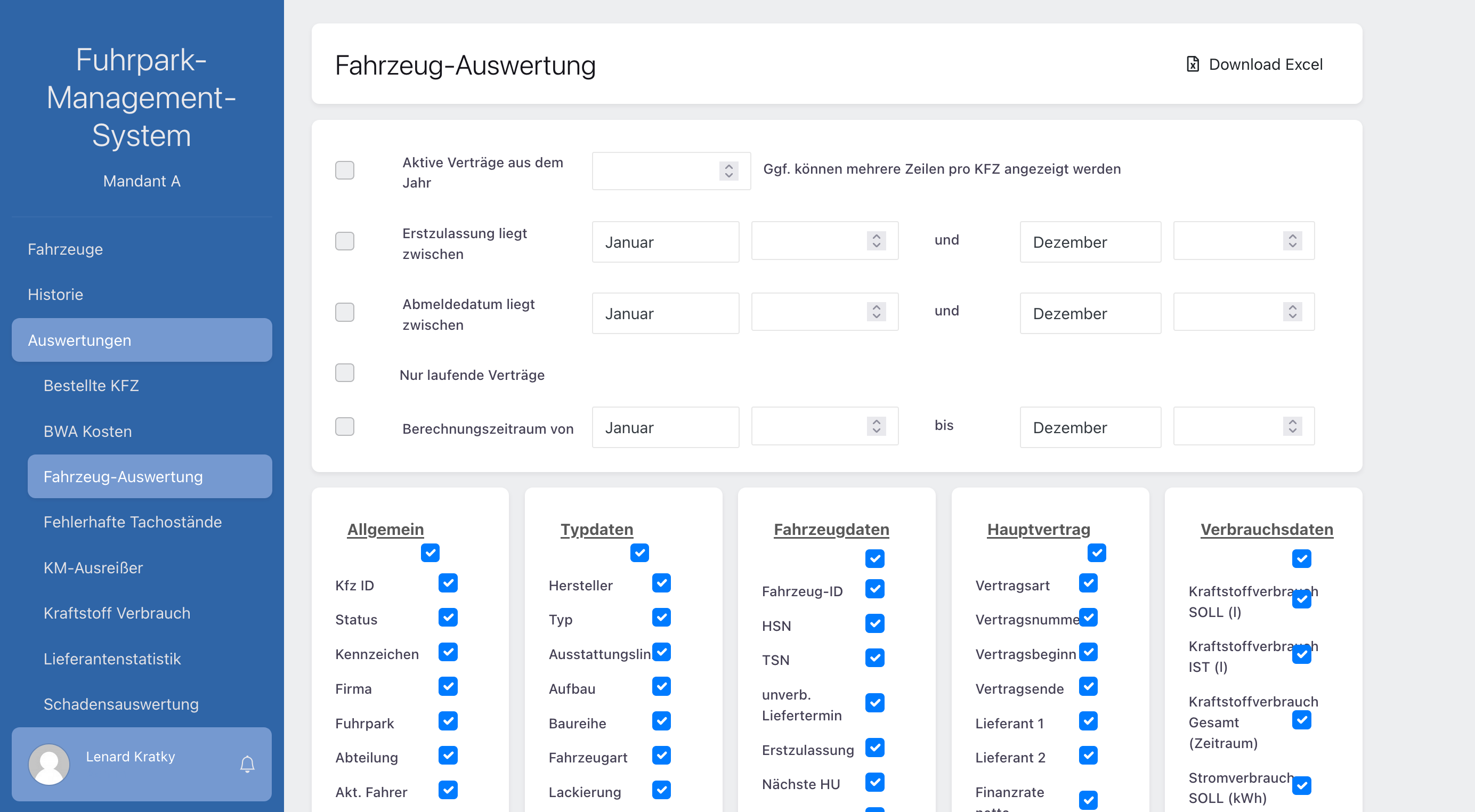 Mit der neuen Administrationsoberfläche ist es sehr schnell und komfortabel möglich, eine Fahrzeugauswertung durchzuführen. Es stehen zahlreiche Auswertungen zur Verfügung, zum Beispiel Verbrauch, Fahrzeugstatistiken, BWA, Lieferantenstatistiken oder Schadensauswertungen. Die Auswertungen können als vorformatierte Excel-Dateien mit mehreren Tabellen und automatischen Formeln heruntergeladen werden.