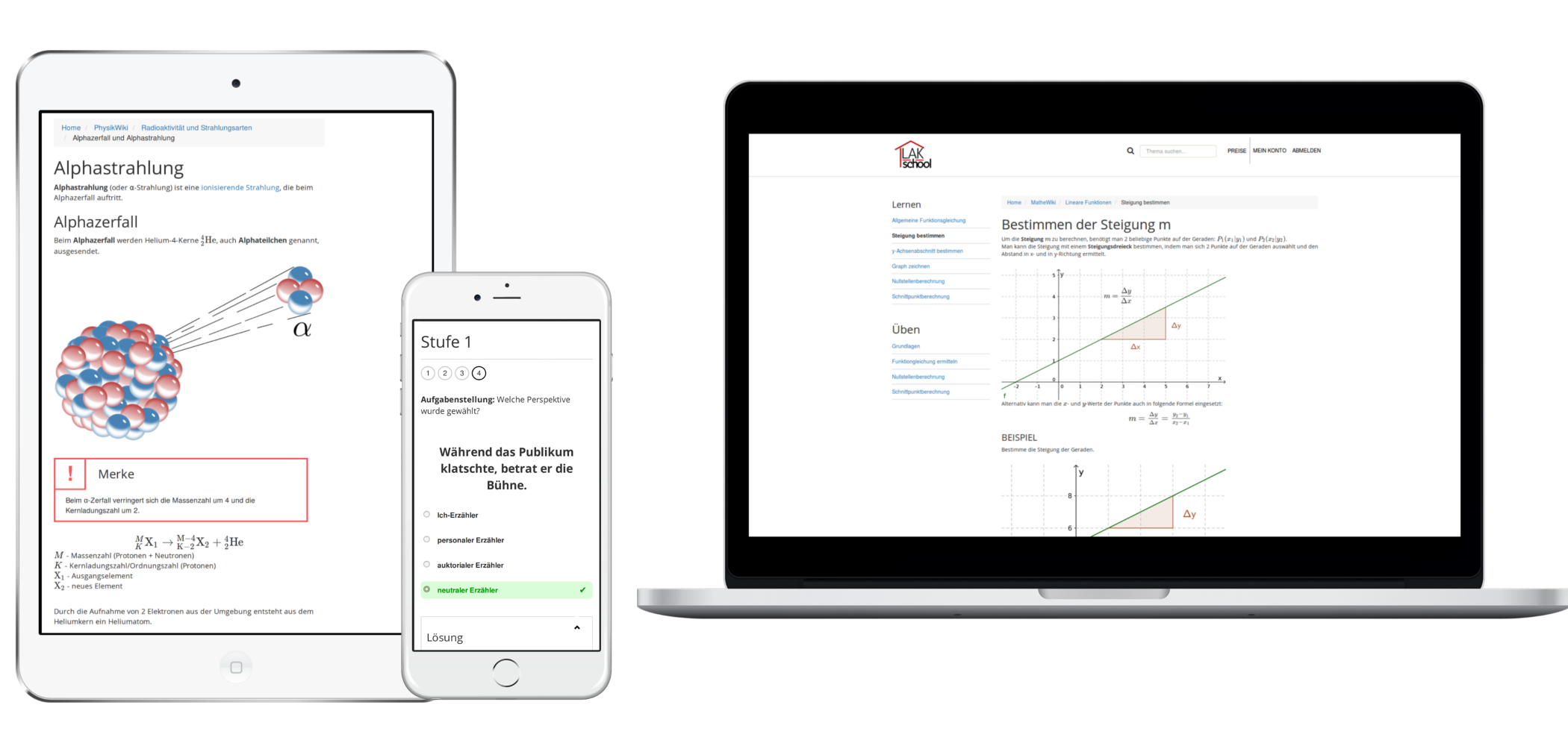 Die umfangreiche Lernplattform LAKschool bündelt und ergänzt das bisherige Angebot aus drei verschiedenen E-Learning-Apps mit insgesamt über 1000 Lerninhalten. Speziell für LAKschool entwickelt haben wir dazu weitere Lern-Modi, eine User-Verwaltung, Zahlungsanbindung, Offline-Funktion und viele weitere Funktionen.