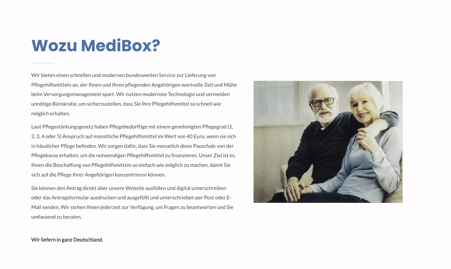 Die MediBox GmbH bietet eine Dienstleistung, die den Prozess der Beschaffung von Pflegehilfsmitteln für die häusliche Pflege vereinfacht. Das Unternehmen legt Wert auf einen schnellen und modernen Service in ganz Deutschland, um Zeit und Aufwand sowohl für die Pflegebedürftigen als auch für die Pflegenden zu reduzieren. Durch einen modernen Webauftritt und den Einsatz von digitalen Anträgen minimiert MediBox unnötige Bürokratie, damit die Kunden ihre Pflegehilfsmittel so schnell wie möglich erhalten.